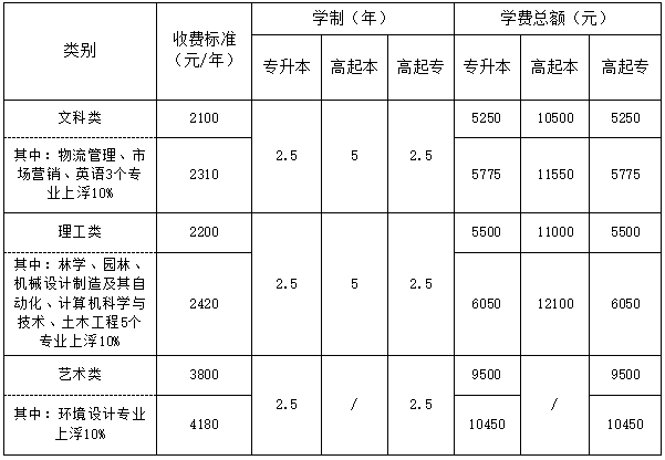 根据《关于进一步加强和规范我省高等学历继续教育收费管理的通知》(湘教发[2023]6号)要求,学生学费按学年收取,由学生本人全额上缴学校。经湖南省教育厅、湖南省发展和改革委员会、湖南省财政厅批准,中南林业科技大学高等学历继续教育林学等9个国家级一流专业自2025级起学费标准上浮10%。学费标准如下: