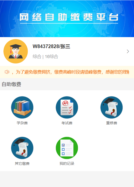 3、登录后,点击“学杂费”,即可缴纳学费、住宿费等