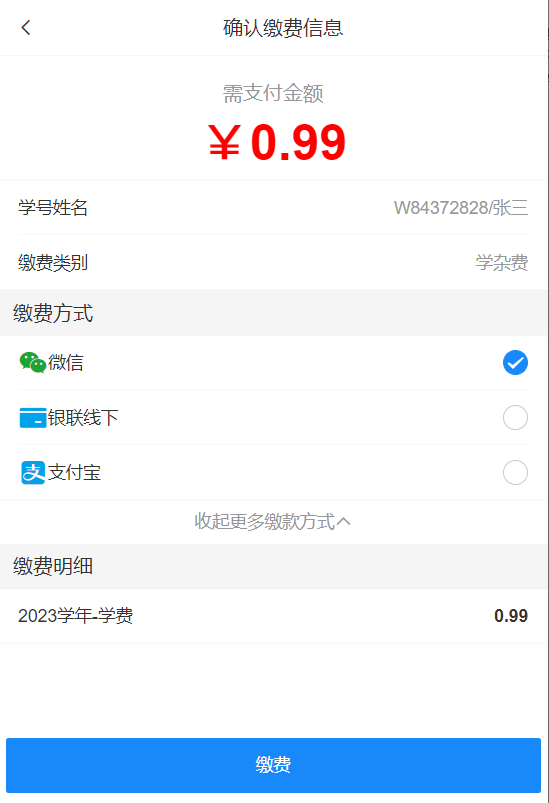 5、确认订单明细和金额,选择缴费方式后,点击缴费
