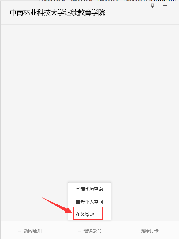 1、微信搜索或扫码并关注“中南林业科技大学继续教育学院”公众号