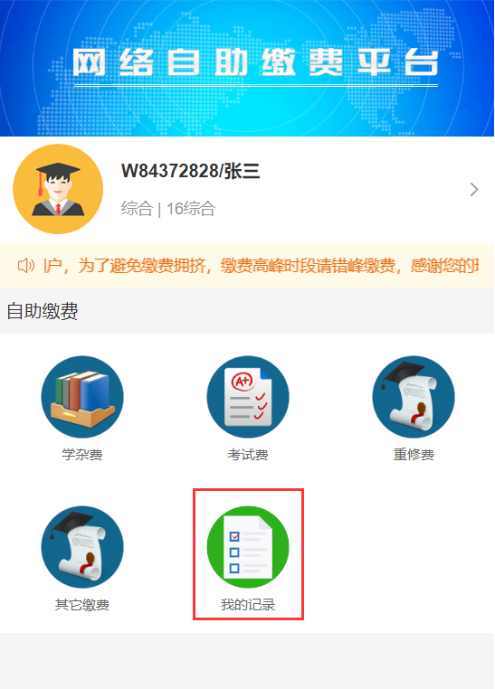 3、登录后,点击“学杂费”,即可缴纳学费、住宿费等