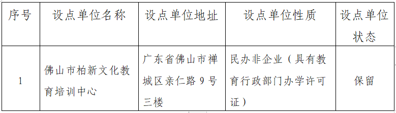 2023年4月6日,经学校党委会研究决定,同意保留广东省佛山市柏新文化教育培训中心校外教学点,现将申请备案的教学点予以公示,公示期为2023年4月6日-2023年4月14日。公示期内,如有异议,可实名质询并提供举证材料。