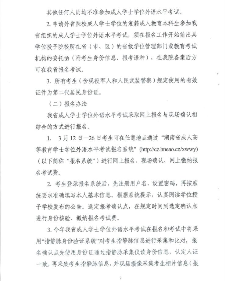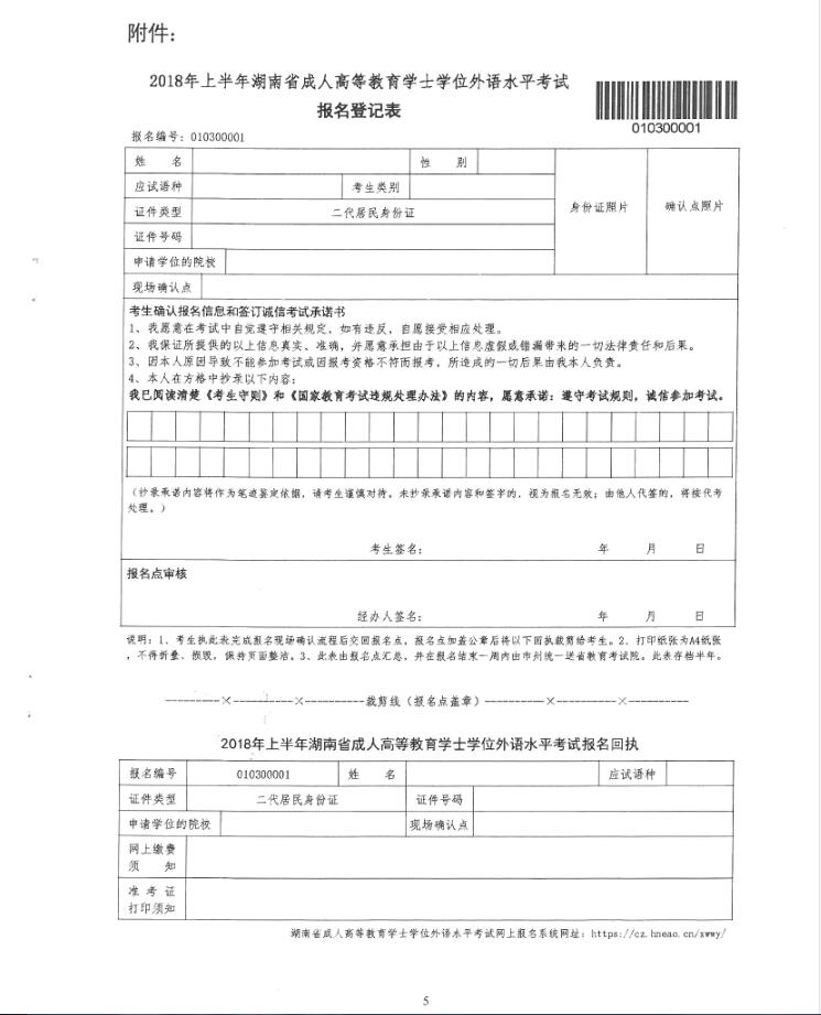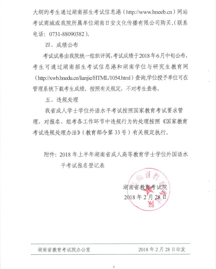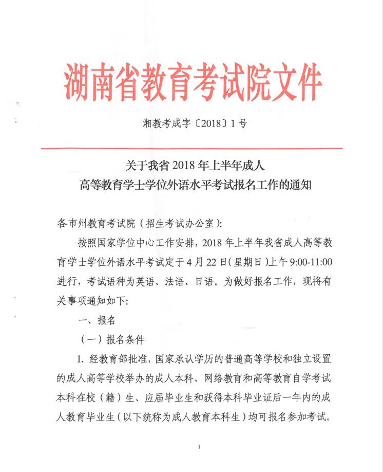 现将省考试院下发的关于今年上半年学位外语考试报名工作通知(湘教考成字〔2018〕1号)转发给你们,请将通知传达给待考学生,指导学生按照规定的时间和流程进行报考。所有考生在任意地点通过报名系统(http://cz.hneao.cn/xwwy)进行网上报名时可以选择自己就近的报名点和考点。
