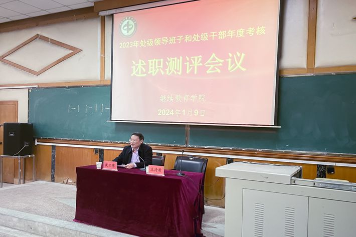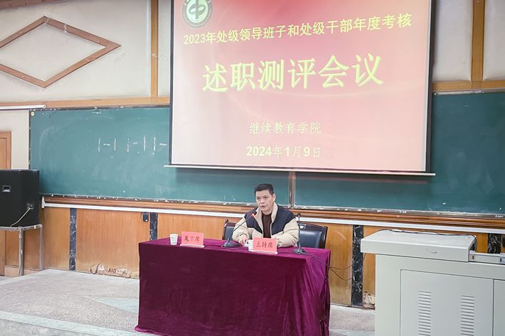 1月9日上午,继续教育学院在知行楼一楼阶梯教室召开处级干部考核述职民主测评大会。学校党委委员、副校长陈冬林,考核领导小组组长廖乐平主任,人事处欧阳珊娜老师等学校考核组成员出席会议,学院全体教职工参加会议。会议由廖乐平主持。
