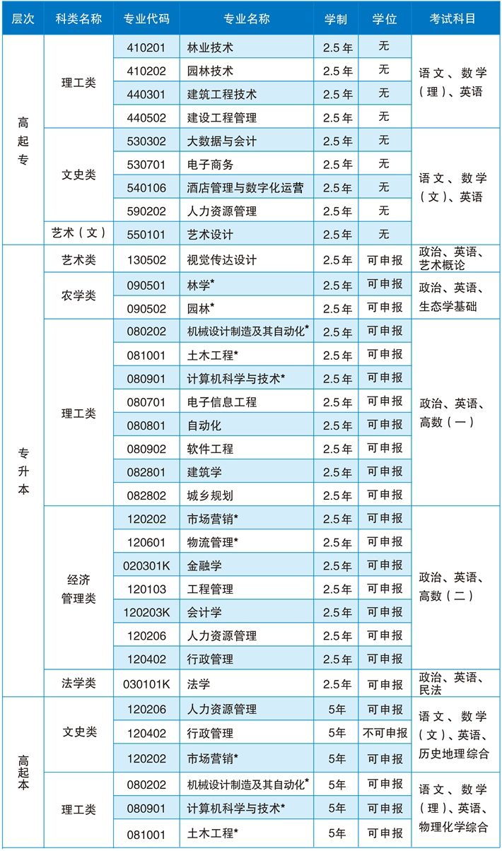 备注:招生专业和考试科目以教育部公布结果为准。带*的专业为国家级一流本科专业建设点对应的高等学历继续教育本科专业;学习形式统一为非脱产。