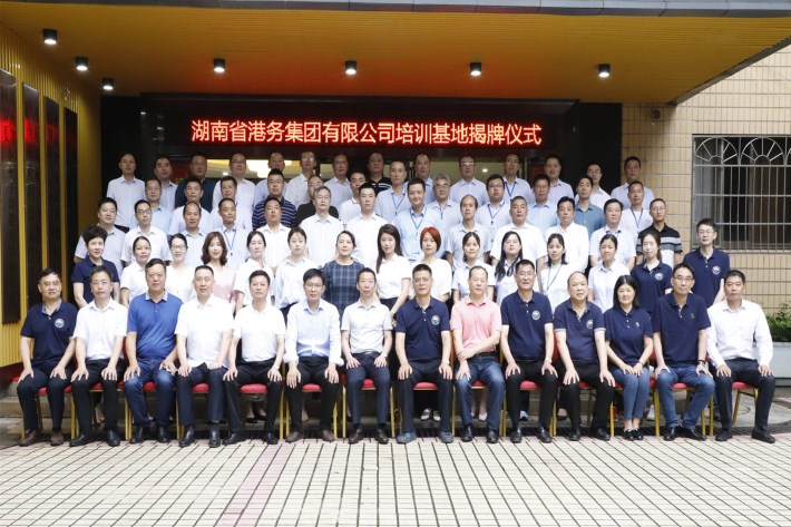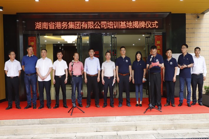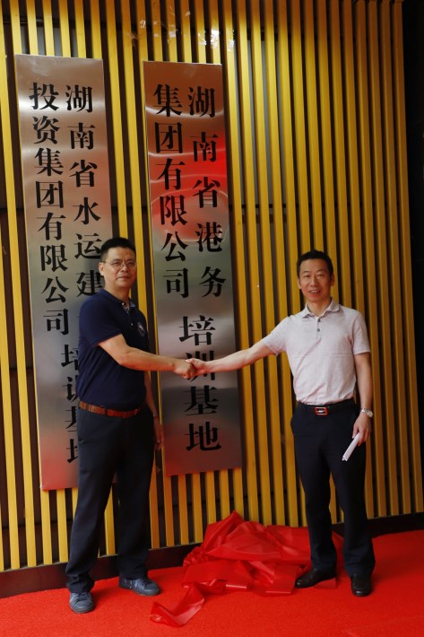 徐国兵和刘梦飞在全体与会人员的见证下共同揭下红绸,为湖南省港务集团有限公司培训基地揭牌,这标志着我校与省港务集团步入合作培训、人才培养新阶段。