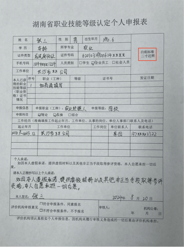(一)按要求填写附件1《湖南省职业技能等级认定个人申报表》(填写样本见附件2)。